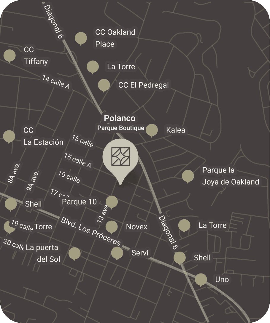 Ubicado en el corazón de zona 10, uno de los sectores más cotizados y dinámicos de la Ciudad de Guatemala, Polanco Parque Boutique ofrece una ubicación privilegiada que combina plusvalía, accesibilidad y cercanía con una infraestructura urbana consolidada.